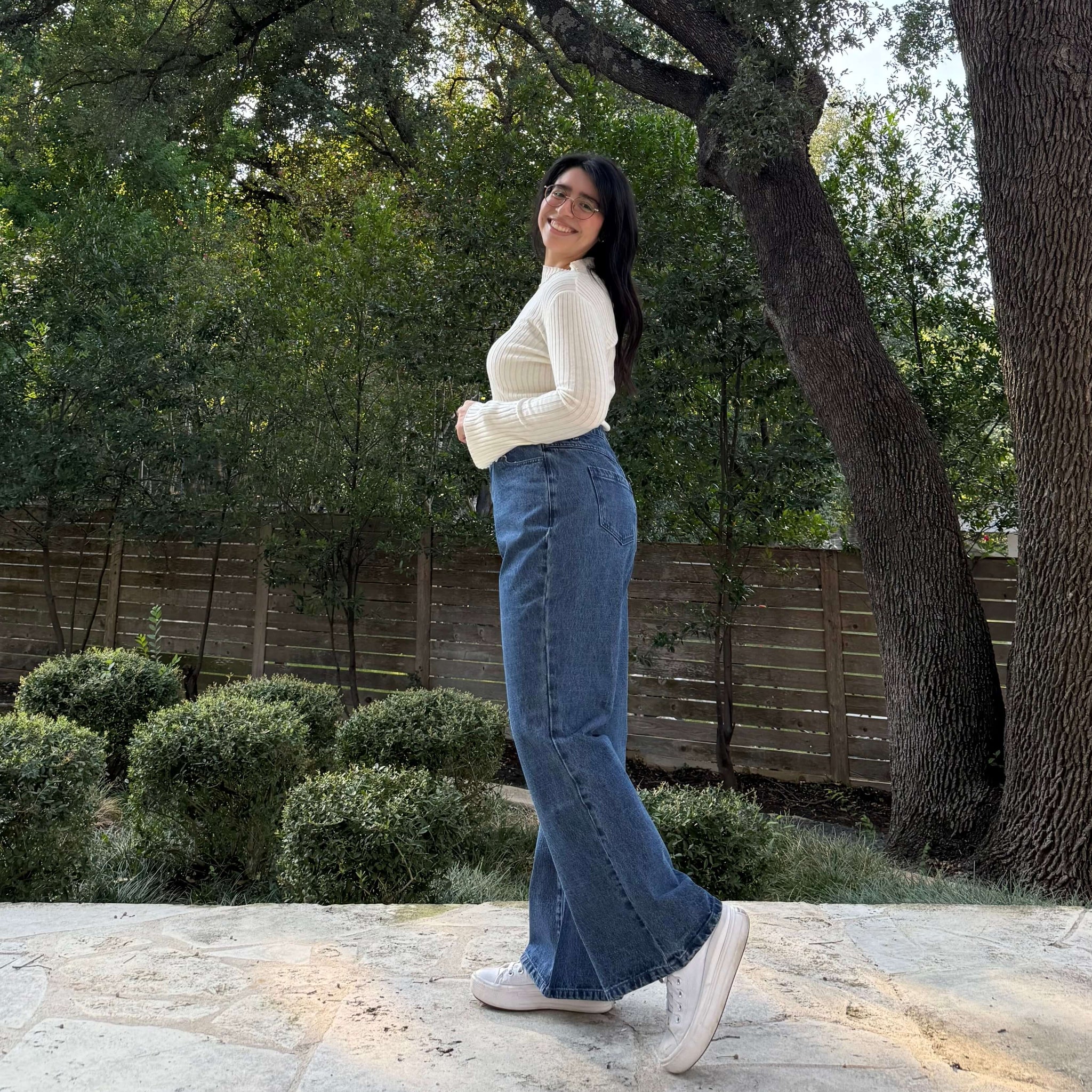 The jeans are meant to be fitted at the waist and a bit loose around the legs.