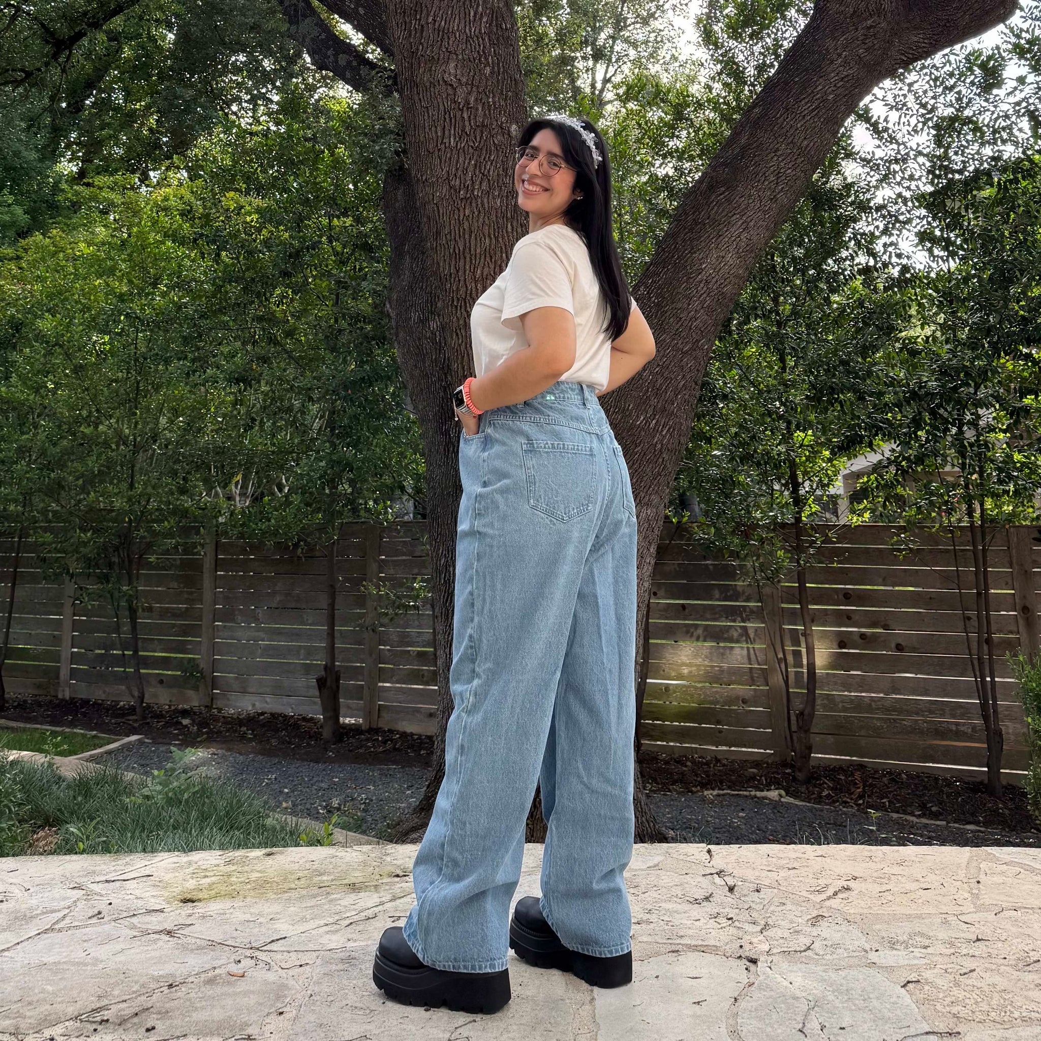 The jeans are meant to be fitted at the waist and a bit loose around the legs.